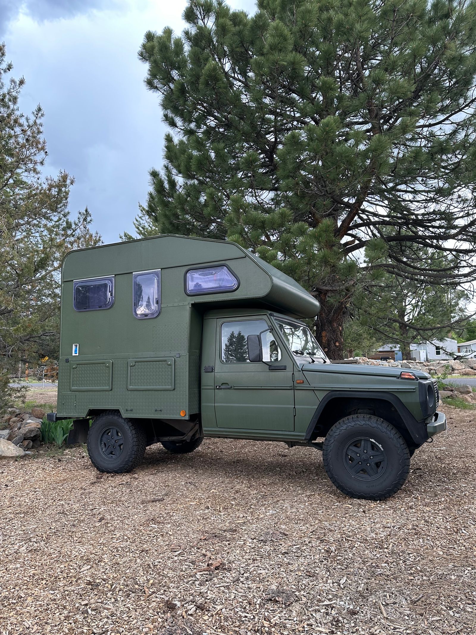 1979 4x4 G class Mercedes camper. Newly installed refurbished turbo diesel by Fit Garage in Bend Oregon. Camper features newly installed diesel heater and solar. Cab over full size bed, 2 person dining space, 3 burner stove, sink, and small closet. 2 person dining space can be converted into an additional sleeping space for 1 person.